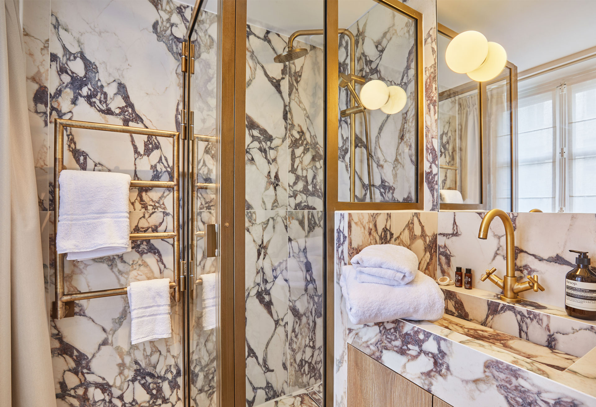 Appartement climatisé de 60m2 avec 2 chambres et 2 salles de bain, situé au 1er étage sans ascenseur dans un bel immeuble parisien avec une magnifique cour pavée.