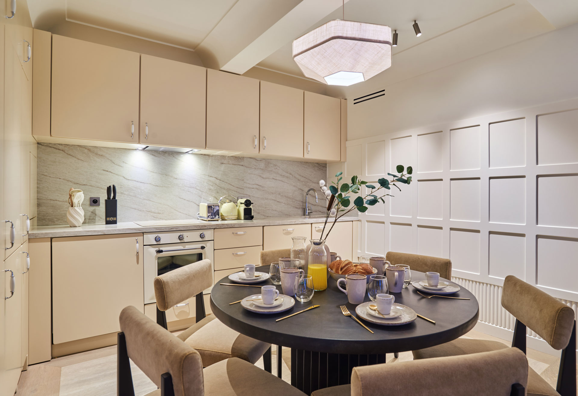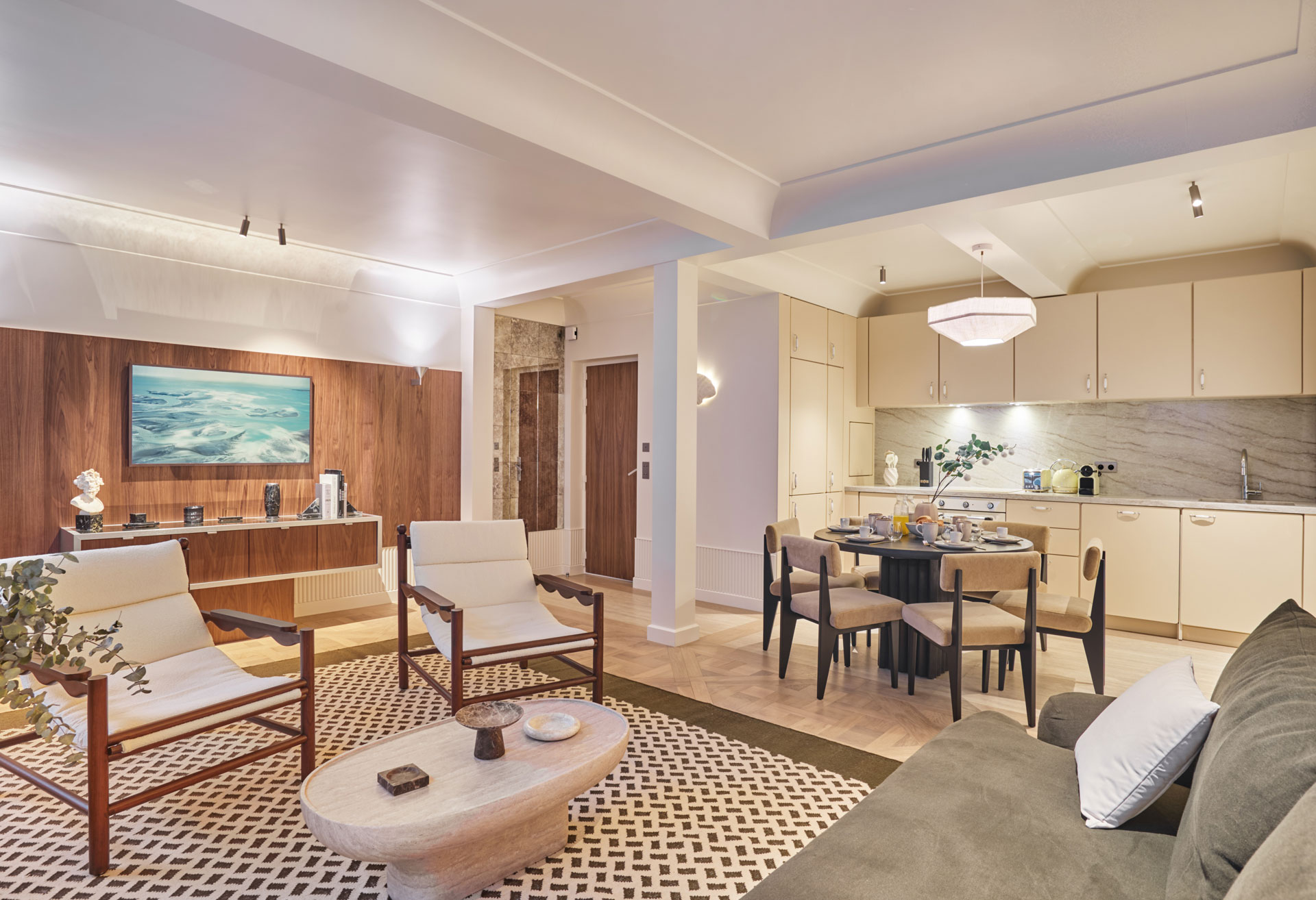- 1 Cuisine ouverte entièrement équipée avec réfrigérateur, congélateur, plaques de cuisson, four, micro-ondes, lave-vaisselle, grille-pain, machine Nespresso